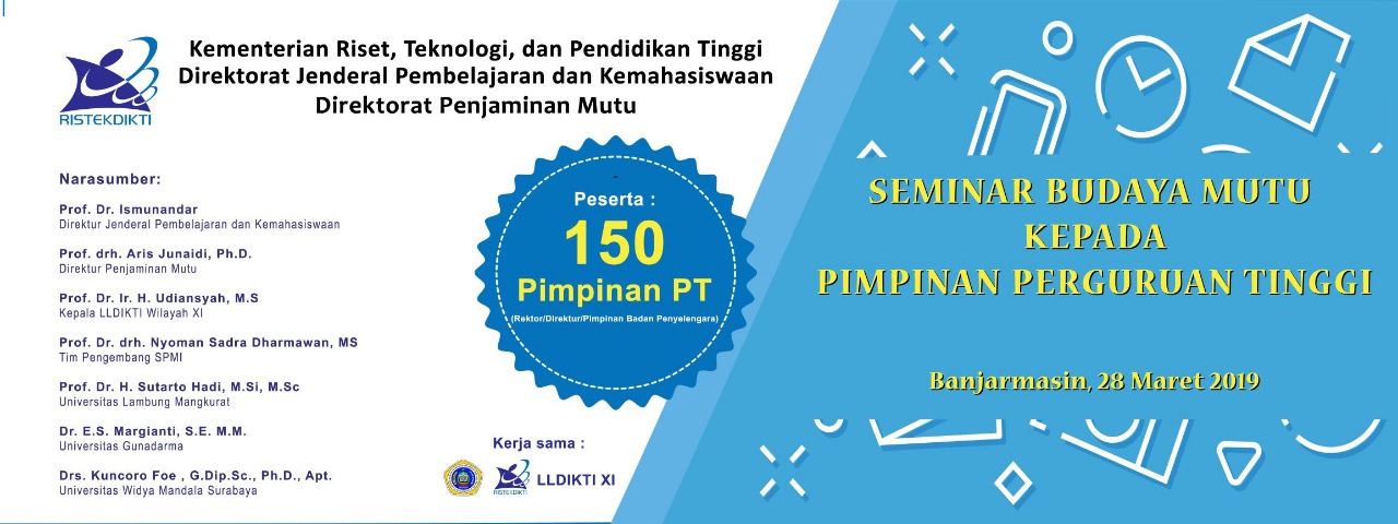 Dalam rangka meningkatkan mutu pendidikan tinggi melalui upaya membangun budaya mutu di perguruan tinggi, komitmen pimpinan dan badan pengelola perguruan tinggi merupakan salah satu faktor kunci keberhasilan. Komitmen dimaksud tercermin dalam kebijakan dan penganggaran yang mendukung upaya peningkatan mutu melalui penerapan Sistem Penjaminan Mutu Internal (SPMI). Mengingat pentingnya peran pimpinan dan badan pengelola pergururan tinggi dalam penjaminan mutu, Tahun Anggaran 2019 Direktorat Jenderal Pembelajaran dan Kemahasiswaan melalui Direktorat Penjaminan Mutu akan menyelenggarakan 3 kali ”Seminar Budaya Mutu kepada Pimpinan Perguruan Tinggi”.