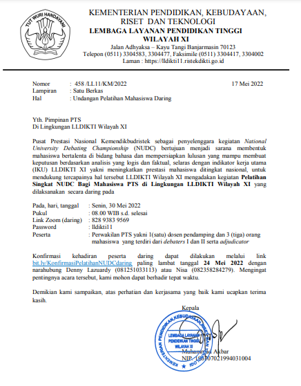 LLDIKTI Wilayah XI mengadakan kegiatan Pelatihan Singkat NUDC Bagi Mahasiswa PTS di Lingkungan LLDIKTI Wilayah XI yang dilaksanakan secara daring. silahkan download disini